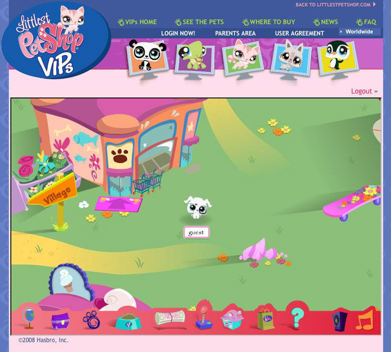 In 2007 and 2008 I art directed the creation of over 15,000 world and character assets for Littlest Pet Shop VIP virtual world. Tying in directly to the massively successful product line via unique codes hidden in character collars, VIP allowed hundreds of thousands of kids to safely navigate the vast virtual world, meet characters, communicate, play mini games, and discover surprises. In the era of Webkins, LPS VIP mixed toys and online gaming in a satisfying experience that was built on in subsequent years.